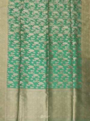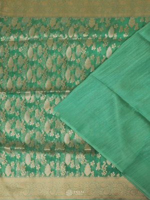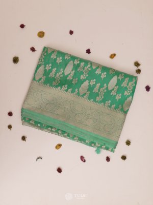 This Aqua Blue Kora Silk Saree exudes a soft, luxurious charm with its sheer, lightweight texture and intricate zari work. The body features delicate floral motifs woven in shimmering gold tones, adding a graceful richness to the translucent fabric. The saree is complemented by a refined pallu adorned with traditional patterns, giving it a timeless festive appeal.