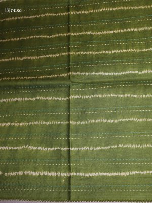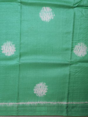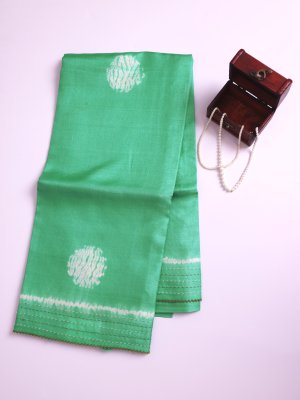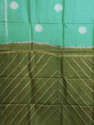 This Turquoise Green Printed Tussar Silk Saree Printed Tussar Silk saree features a vibrant body adorned with circular white Shibori motifs. The highlight is the contrasting Olive green pallu, intricately detailed with a V-shaped pattern in hand-done Kantha embroidery and finished with elegant tassels. Framed by a textured Kantha-stitched border, this drape seamlessly combines traditional craft with a modern, refreshing color palette.
