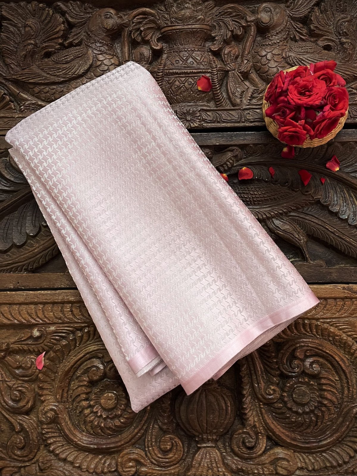 This Handwoven Baby Pink Banaras Silk Blouse has silver zari floral detailing woven all over.