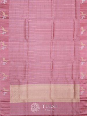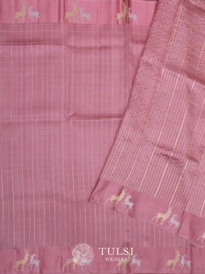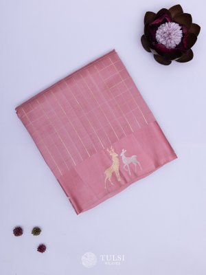 This chic Baby Pink Banaras Silk Saree featuring unique satin border is adorned with deer butta, making it a standout piece for any occasion. Crafted from luxurious Banaras silk, the body has zari checks which combine elegance and comfort effortlessly. This saree will surely turn heads and add a touch of sophistication to your wardrobe
