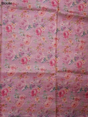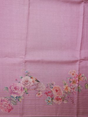 This baby pink Tussar silk saree features delicate floral prints paired with subtle zari detailing. The borders are enhanced with elegant zari work, adding a gentle shimmer. The pallu is beautifully adorned with floral motifs and woven zari accents for a rich finish. Perfect for a refined and feminine look.