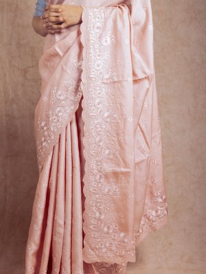 This beautiful tussar silk saree features a shade of baby pink all over the body and has a floral embroidery design on the border, which makes this saree perfect for every occasion.