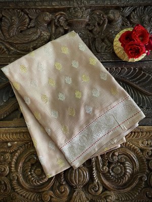 This Handwoven Beige Banaras Silk Blouse has gold and silver floral zari buttis spread all over.