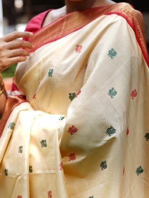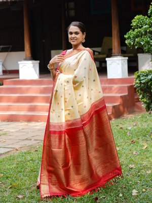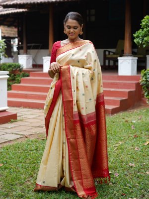 This handwoven Kanjeevaram silk saree features a shade of beige and has equally spaced pattu mayil butta in dark green and red. This stunning saree is paired with a red border detailed with a Mayil Kannu pattern.