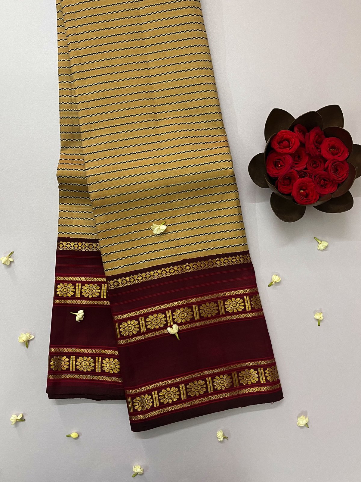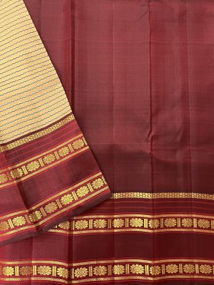 This handwoven beige Kanjeevaram silk saree has black thread veldhari detailing woven all over. It is paired with an exquisite maroon korvai border that is adorned with floral embellishments in pure gold zari.