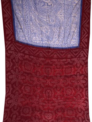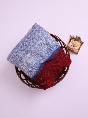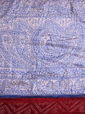 This elegant Tussar Silk Saree features a soft beige body adorned with delicate pastel dark blue Madhubani prints, creating a subtle yet artistic charm. The contrast dark red border is enhanced with traditional Bandhini effects, beautifully mirrored on the pallu and blouse. Lightweight and graceful, this saree effortlessly blends artistry with comfort, making it perfect for festive occasions or casual celebrations.