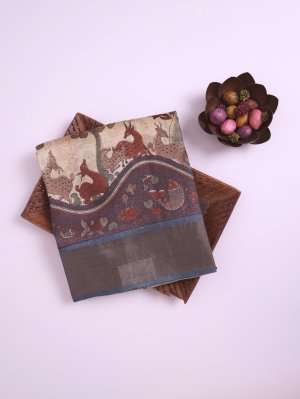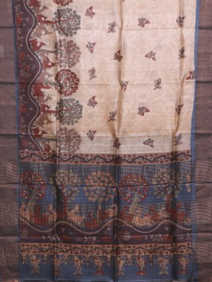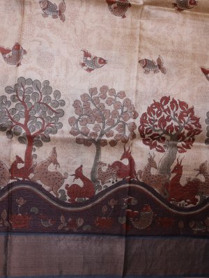 This Beige Printed Tussar Silk Saree features a natural sand-beige color with a light, breathable texture that stays crisp and elegant all day. The design celebrates nature with traditional forest artwork, featuring the "Tree of Life," graceful spotted deer, and playful fish. Painted in warm brick red and leaf green, these motifs capture the charm of ancient tribal wall art with a clean, modern finish.