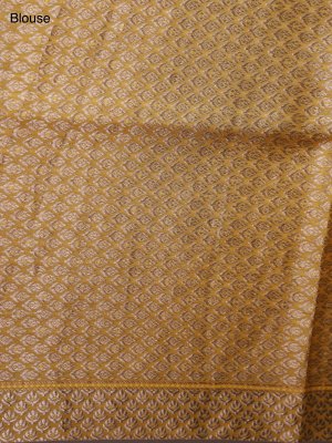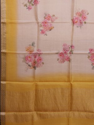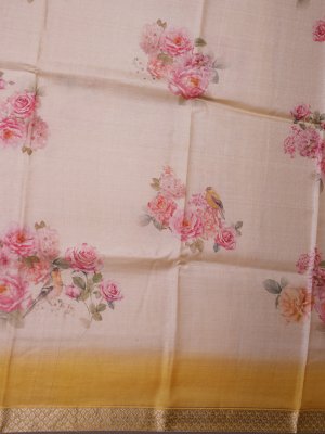 This beige Tussar silk saree features vibrant mustard-yellow borders and pallu, creating a striking contrast. The body is adorned with delicate floral prints in soft pink, peach, and green hues, adding an elegant, feminine touch. A subtle zari border enhances its traditional charm, giving the saree a graceful and refined look.