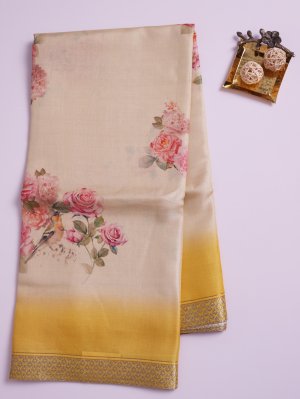 Beige Printed Tussar Silk Saree with Yellow Border
