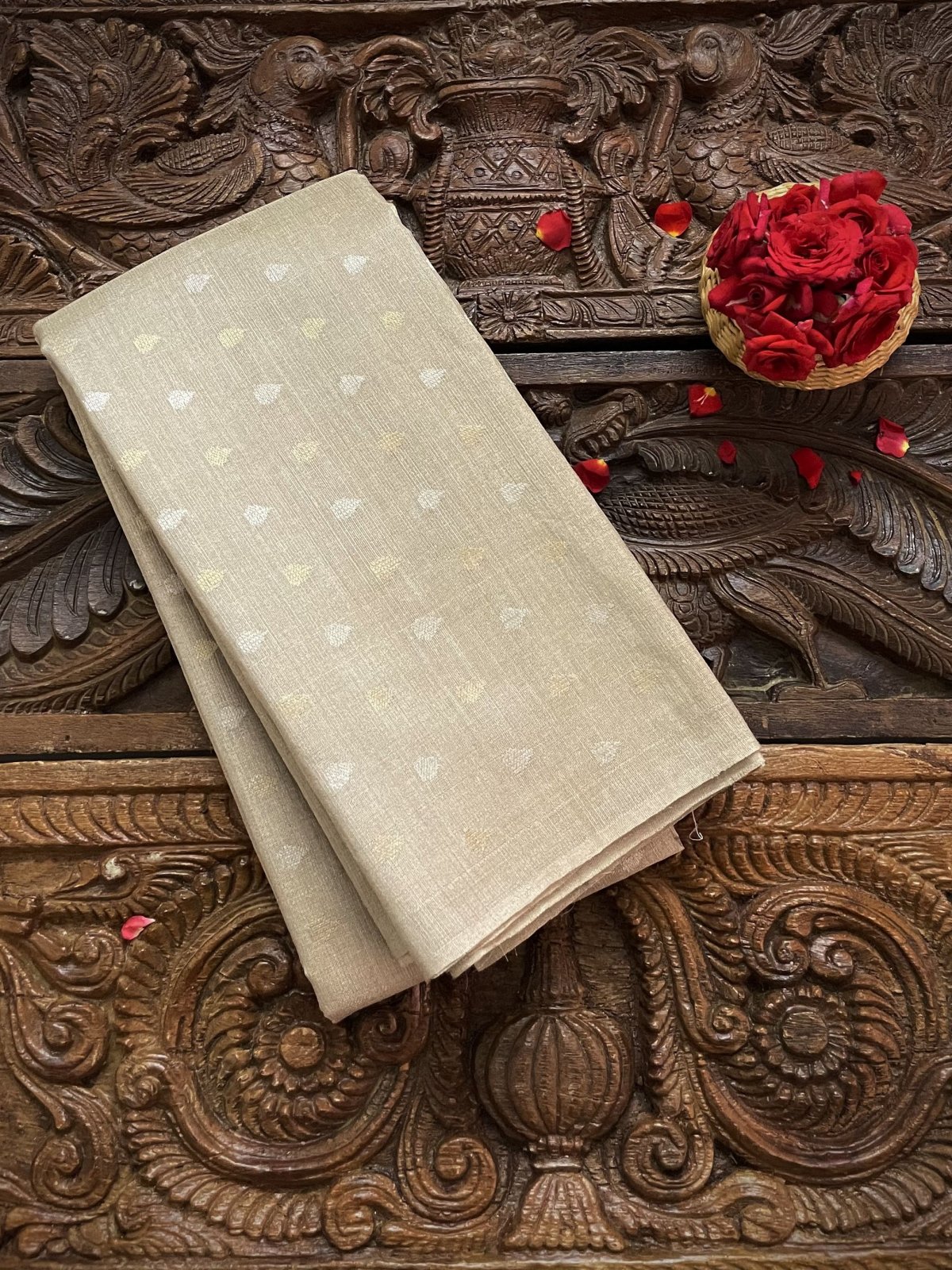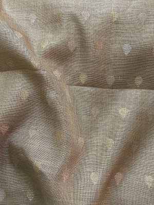This Handwoven Beige Tussar and Tissue Silk Blouse is adorned with Gold and Silver Zari Butties All Over.