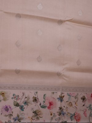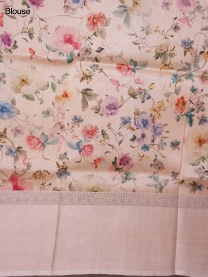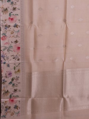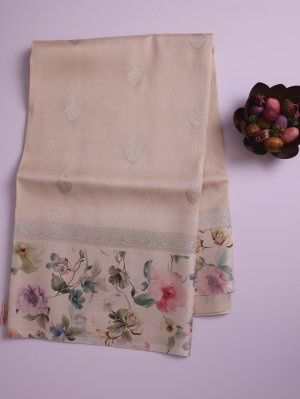 This elegant beige tussar georgette silk saree features exquisite zari buttas scattered across the body, adding a subtle shimmer. Its floral-patterned border beautifully complements the intricate zari work on the border and pallu, creating a perfect blend of traditional craftsmanship and delicate design. Ideal for festive and special occasions, it radiates grace and sophistication.