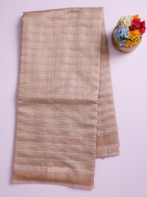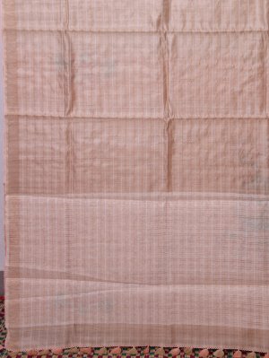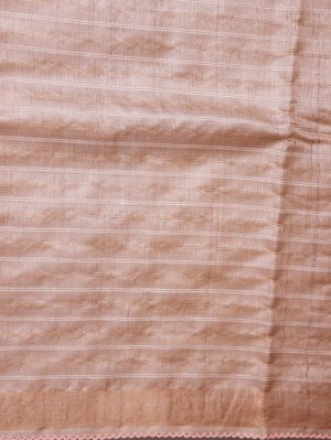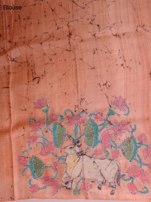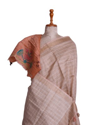 This beige tussar saree showcases fine zari-lined patterns paired with delicate white thread accents that enhance its understated elegance. Complemented by a burnt orange batik blouse featuring detailed kantha embroidery, the combination brings a lively contrast and artisanal charm. The overall look effortlessly merges classic craftsmanship with contemporary style for a polished and graceful appearance.