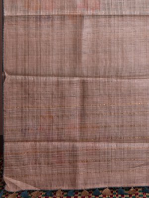 This elegant tussar saree features a natural beige base with fine zari lines and subtle white thread work woven across the body, giving it a refined texture. It is paired with a vibrant teal batik blouse adorned with colorful floral patterns that create a striking contrast. Delicate kantha embroidery along the borders enhances its handcrafted charm, while small tassels add a graceful finishing touch, reflecting understated elegance.