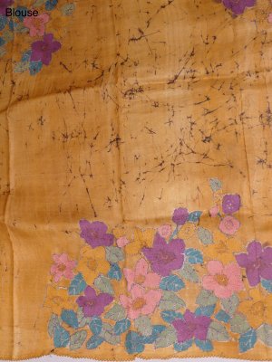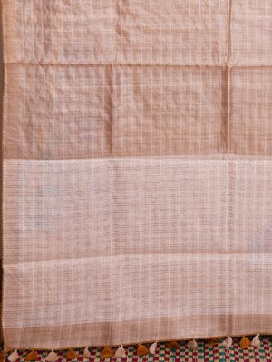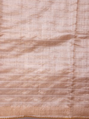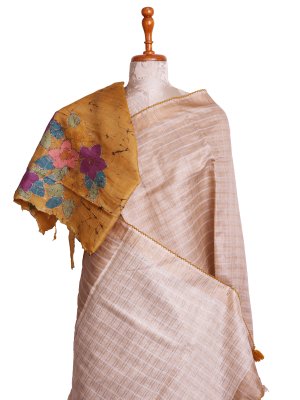A beige tussar saree highlighted with fine zari stripes and subtle white thread detailing across the fabric. It is paired with a vibrant Mustard yellow batik blouse that adds a lively contrast. The kantha embroidery enhances its artisanal charm, creating a look that feels both timeless and distinctive. Perfect for understated festive wear or elegant daytime occasions.