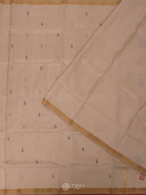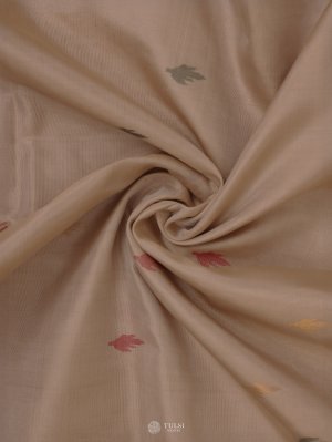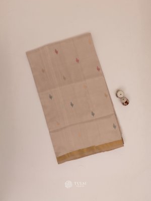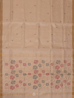 This Beige Uppada Silk Saree features beautiful floral butis on the body, paired with a delicate zari border, creating an elegant and refined look. The rich silk fabric adds a touch of grace and sophistication to any occasion.
