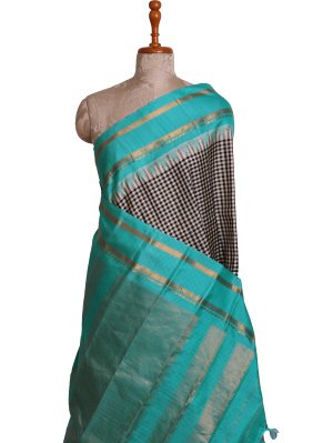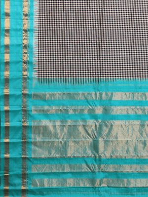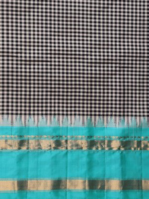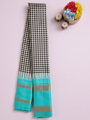 This Black and White Checked Gadwal Silk Saree artfully pairs a crisp monochrome body with a soulful light blue silk border. Accented by simple, linear zari, the breathable silk-cotton blend ensures a structured, slimming drape and exceptional all-day comfort. Refined, authoritative, vibrant elegance—this sophisticated design celebrates the modern woman who values understated grace and timeless geometric precision.