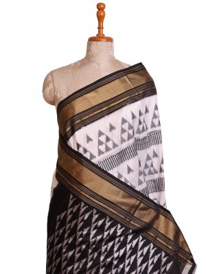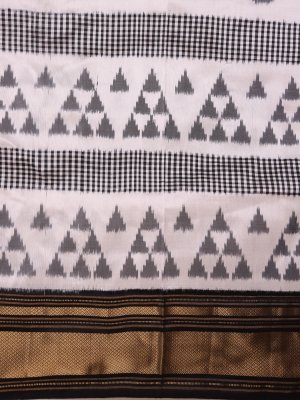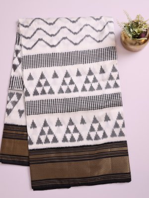 A black and white ikat silk saree with a checked pattern subtly combined with wave motifs across the body, creating a striking visual texture. It features a solid zari border that adds a touch of timeless elegance. Crafted in smooth silk, the saree drapes gracefully, blending classic artistry with contemporary style.