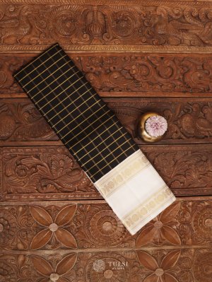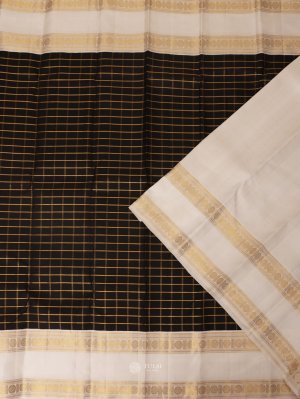 This Black Checked Kanjeevaram Silk Saree features vibrant checks on the body with a rich White border. The striking color contrast and luxurious silk fabric make it an ideal choice for any celebration.