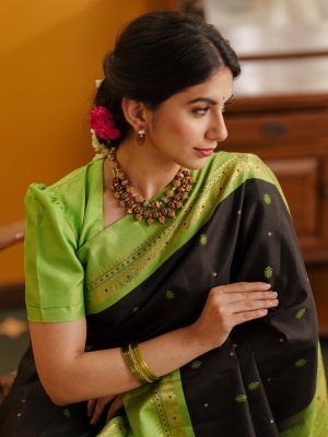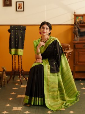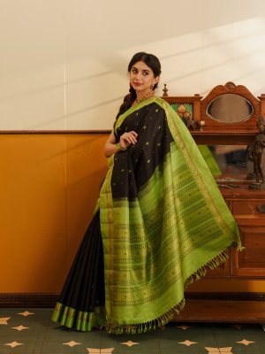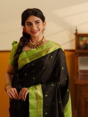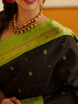 This Black Kanjeevaram Silk Saree featuring a stunning parrot green border and pallu. The deep black body is beautifully detailed with intricate butta motifs all over, adding a touch of traditional artistry to its classic look. The rich silk drapes gracefully, while the vibrant green border brings out a perfect contrast that catches every eye. With itsvintage charm and luxurious texture.