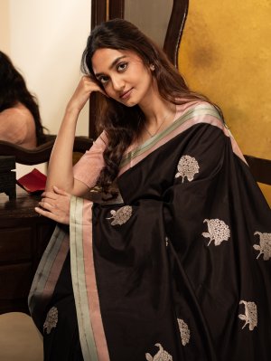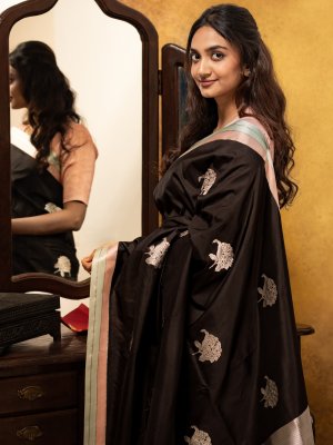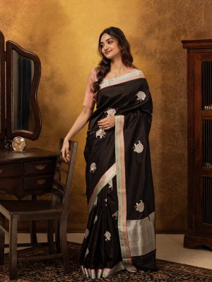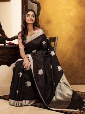 The Black Mashru Silk Saree features a sophisticated blend of traditional and contemporary design elements. It is adorned with delicate floral buttas across the body, which add a subtle elegance. The saree is complemented by a striking striped border, enhancing the overall aesthetic with a touch of modern flair.
