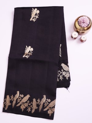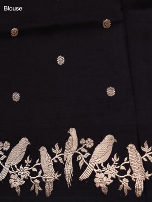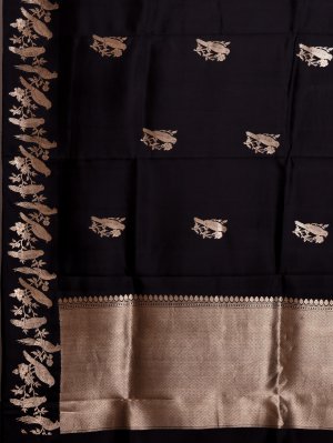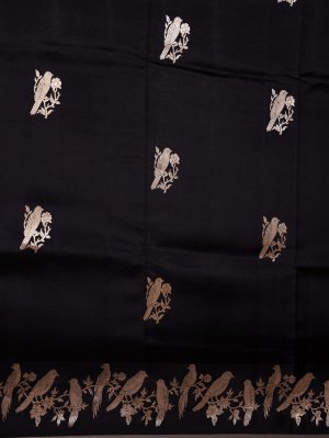 This elegant black Mashru silk saree features a rich, lustrous texture with delicate gold woven motifs scattered across the body. The borders are adorned with intricate floral and bird-inspired patterns, adding a traditional charm. A wide, shimmering gold pallu enhances its regal appeal. Perfect for all occasions, it blends timeless craftsmanship.