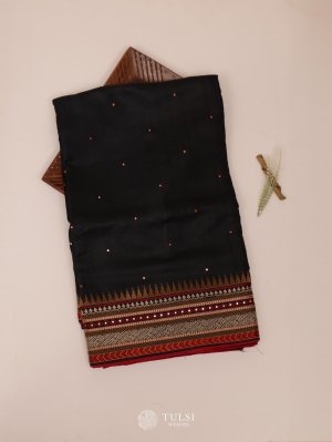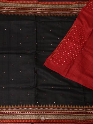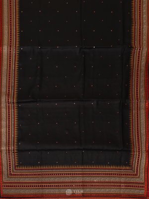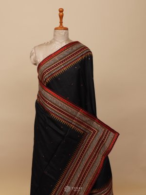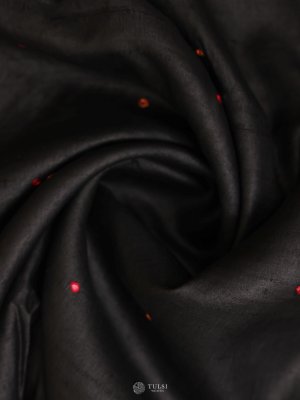 This Black Tussar Silk Saree exudes understated elegance with its rich, natural sheen and fine texture. The saree features beautifully embroidered borders in contrasting hues, adding depth and refinement to its classic appeal. Subtle woven dots across the body enhance its charm.