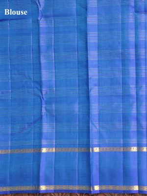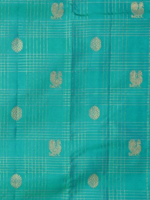 This elegant Blue-Green Kanjeevaram silk saree is adorned with delicate zari checks and intricate peacock and kamalam butti designs, radiating sophistication. Its contrasting Mayil Kazhuthu border beautifully enhances the overall look with a vibrant touch. The blouse, in matching Mayil Kazhuthu, features refined zari stripes, adding a hint of sparkle. Perfectly blending rich hues and traditional craftsmanship, this saree makes a graceful statement for special celebrations.