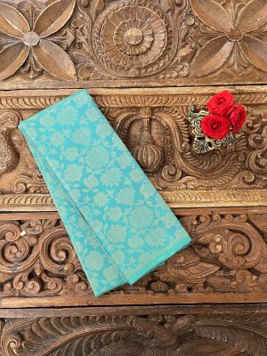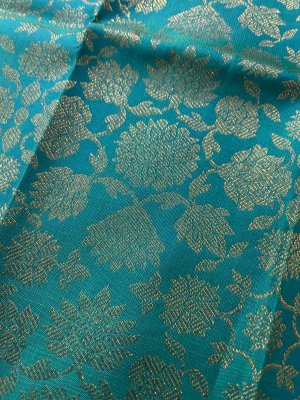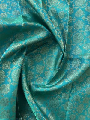 This handwoven aquamarine blue Kanjeevaram silk blouse is adorned with elaborate floral pure gold zari brocade all over.