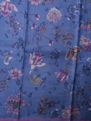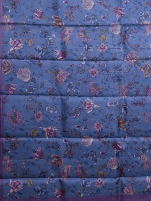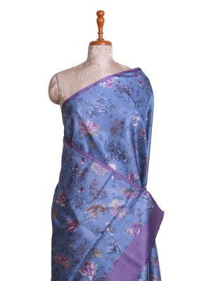This Blue Printed Tussar Silk Saree features a lightweight body adorned with intricate all-over floral prints in shades of lilac and violet that offer a smooth and matte texture. The structural border is defined by a solid contrasting lavender edge that adds a clean and contemporary frame to the soft drape of the fabric. The pallu is finished with simple neat edges and continues the floral theme with delicate vine-like patterns making it a perfect choice for refined day wear.