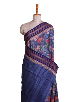 Blue Printed Tussar Silk Saree with Navy Vidarbha Border