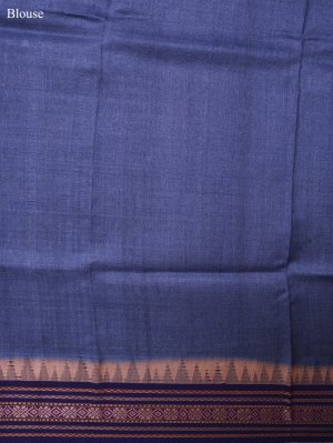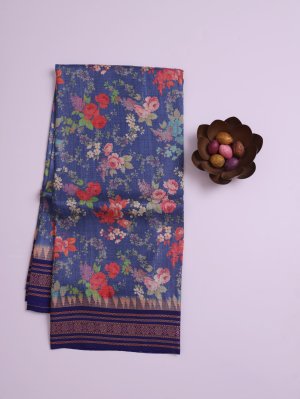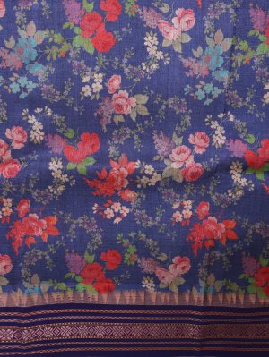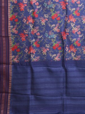 This Blue Tussar Silk saree features a lustrous textured body adorned with vibrant red and pink floral prints. The deep navy blue Vidarbha border showcases intricate temple-inspired geometric patterns, providing a smooth and structural finish to the edges. A matching blue pallu is detailed with horizontal stripes of navy blue, creating a cohesive and elegant look for any occasion.