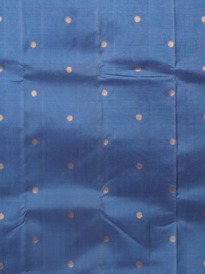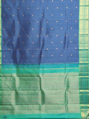 Embrace regal elegance with this Kanjeevaram silk saree, featuring a sophisticated bluish-grey body embellished with intricate rudraksh zari buttas. The contrasting greenish-blue border and pallu showcase timeless traditional motifs, perfectly paired with a coordinating blouse adorned with delicate diamond buttas for a majestic finish.