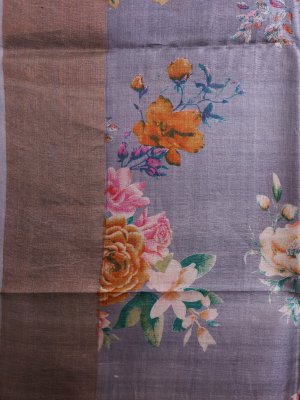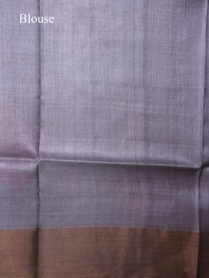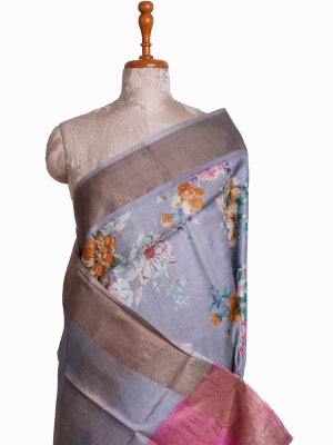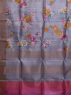 This lovely saree is made from Bluish-Grey Tussar Silk, which has a cool, modern color and a natural textured feel. It is decorated with bright and colorful floral prints in pretty shades of pink and yellow. The saree features a wide antique silver border that gives it a classy and shiny look. The fabric is very light and comfortable, making it easy to wear all day long. It is a perfect choice for anyone looking for a fresh, stylish, and elegant outfit.