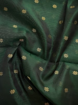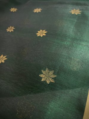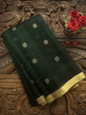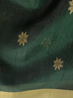 This Handwoven Bottle Green Chanderi Silk Blouse is embellished with gold zari floral buttis accompanied by gold borders.