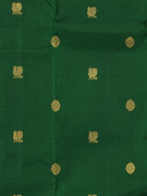 Radiating charm and tradition, this Bottle Green Kanjeevaram silk saree is accentuated with intricate mayil chakram body buttas. The contrast Rani Pink border and blouse adds a pop of color, enhancing its graceful appeal. The pallu richly designed with peacocks, elephants, and geometric patterns, creating a stunning visual narrative. Perfect for special celebrations, this saree exudes luxury, grace, and cultural artistry.