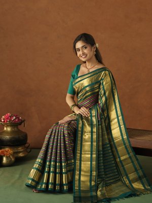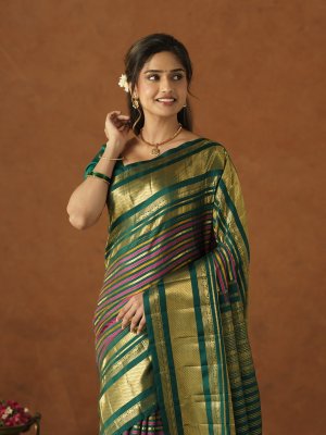 This Bottle Green Kanjeevaram silk saree showcases a rich body detailed with vibrant magenta horizontal stripes and shimmering gold zari motifs. The design is anchored by a broad bottle green border featuring intricate geometric gold weaving and an ornate, heavy zari pallu. Elegant thread tassels complete the look, offering a regal and timeless aesthetic for any grand occasion.