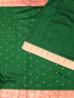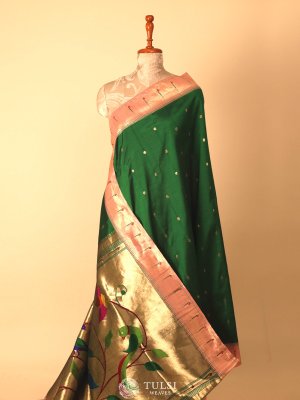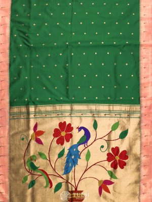 This Bottle Green Paithani Silk Saree is adorned with intricate zari buties on the body and border, along with a rich zari pallu. Its colorful designs bring a vibrant.