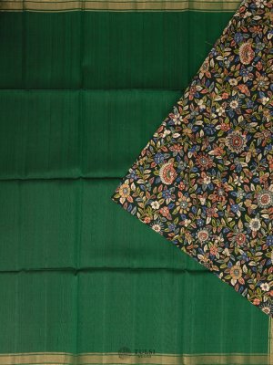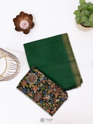 In the verdant shade of green, this raw silk saree captures the essence of nature's beauty and vitality with zari border and floral printed blouse. Crafted from luxurious raw silk, it exudes a rich texture and understated elegance.