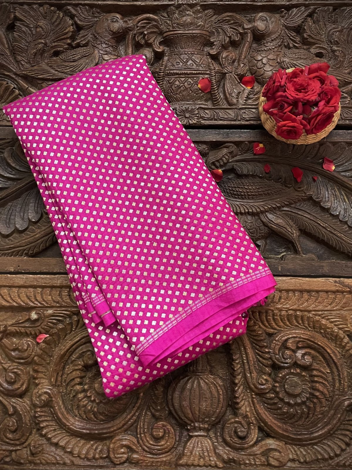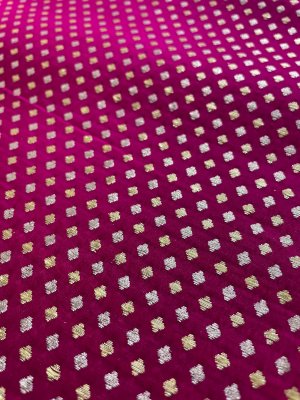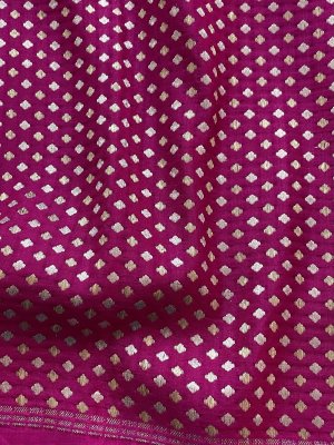 This Handwoven Bright Pink Banaras Silk Blouse has gold and silver detailing woven all over.