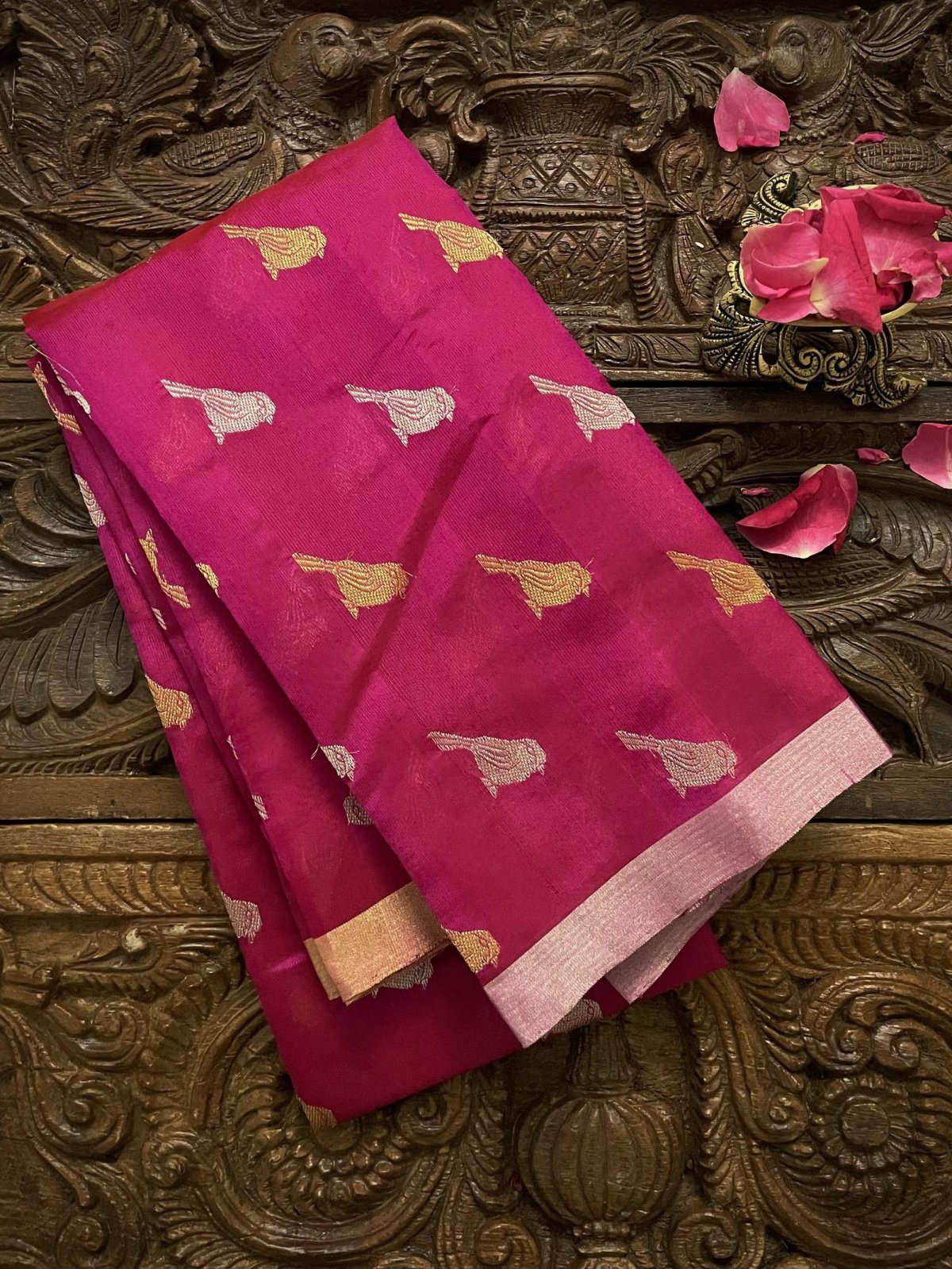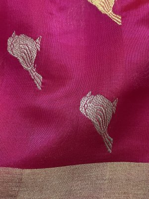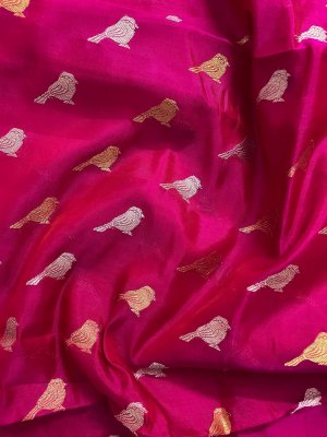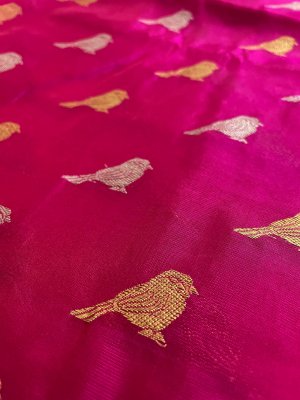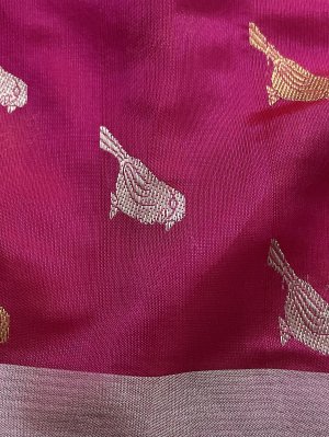 This Handwoven Bright Pink Chanderi Silk Blouse is embellished with gold and silver zari bird motifs accompanied by gold and silver borders.