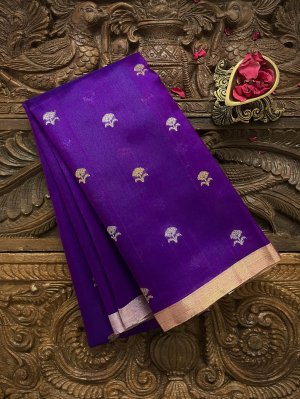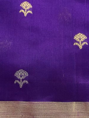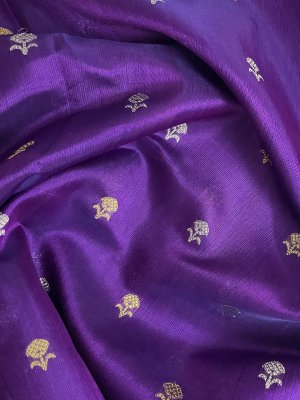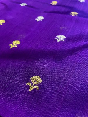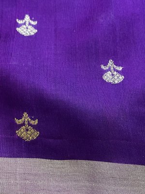 This Handwoven Bright Purple Chanderi Silk Blouse is embellished with gold and silver zari detailing accompanied by gold and silver borders.