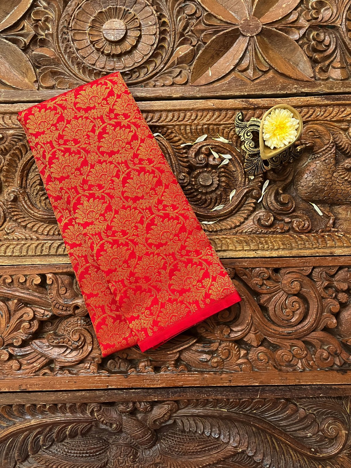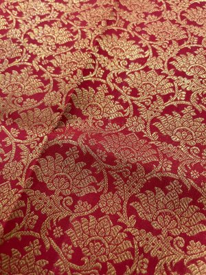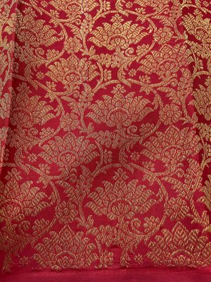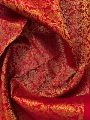 This handwoven bright red Kanjeevaram silk blouse is adorned with elaborate floral gold zari brocade all over.