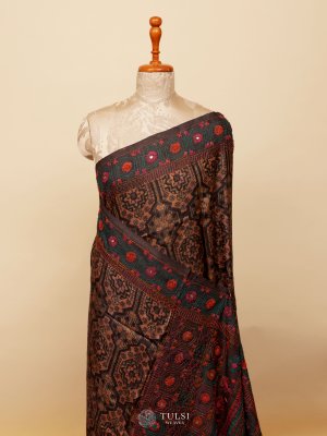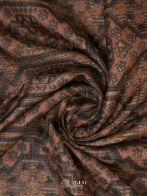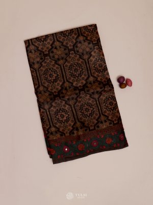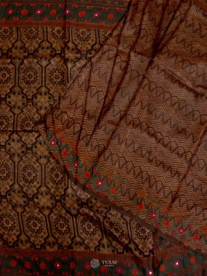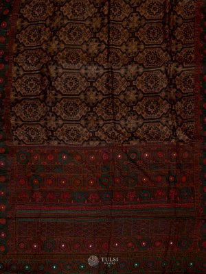 This Brown Tussar Silk Saree is adorned, creating a beautifully textured look. The pallu and borders feature striking geometric and floral detailing in mustard, green, and red, adding vibrant contrast. The soft silk fabric offers a graceful, fluid drape, while the rich detailing lends a refined touch of traditional artistry.
