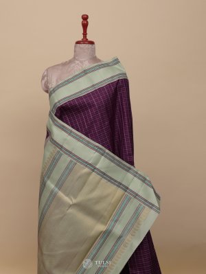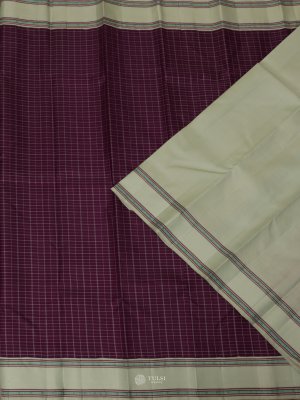 This Burgundy Kanjeevaram Pattu Pett Silk Saree captures the essence of traditional grace. The soft Burgundy body exudes a gentle sheen, complemented beautifully by a delicate green border and pallu woven with intricate patterns.