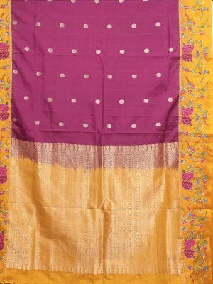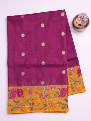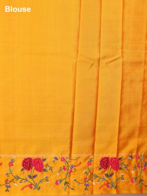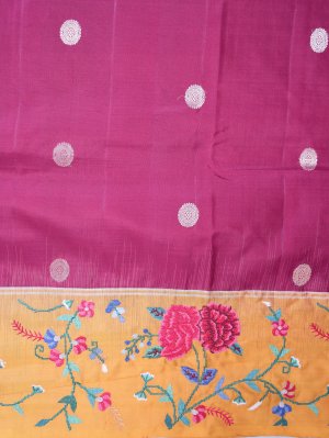 A stunning soft silk saree in deep burgundy, featuring intricate zari kamalam buttas that shimmer gracefully. The mustard yellow border is adorned with lively multi-color floral cross-stitch embroidery, adding a playful charm. Its pallu and blouse in matching mustard yellow create a bold contrast that enhances the saree’s elegance. Perfect for festive events or weddings, it’s a blend of tradition and modern artistry.