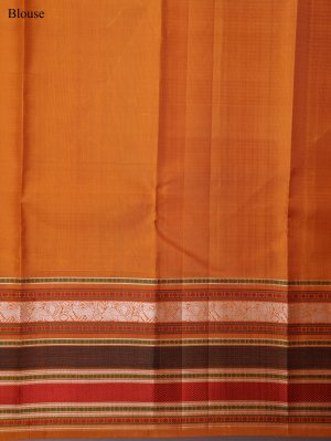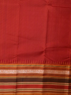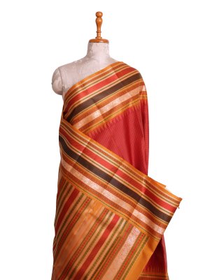 This Burnt Red Kanjeevaram Pattu Pettu Silk saree showcases a tactile micro-checked body paired with a multi-tonal mustard and chocolate brown border. The fabric possesses a firm, lustrous texture, transitioning into a dense pallu layered with metallic accents, geometric stripes, and traditional temple-inspired patterns. A rich, matte mustard yellow finish anchors the drape, making it an ideal choice for cultural ceremonies and festive bridal guest attire.