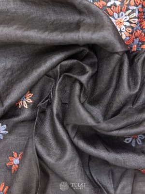 This Charcoal Grey Tussar Silk Embroidered Blouse captivates with its timeless charm and elegance. It is adorned with delicate floral embroidery.