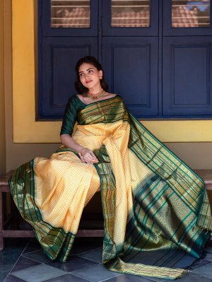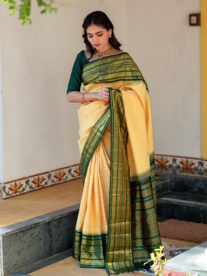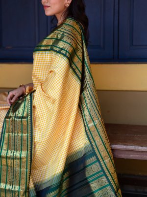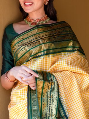 This handwoven Kanjeevaram silk saree features checks in yellow and off-white woven all over. It is paired with a bottle-green pillayar rekku korvai border, embellished with pure gold zari detailing along with threadwork highlights.