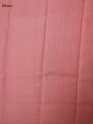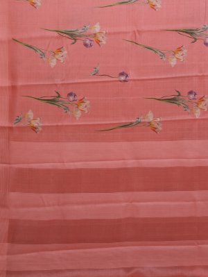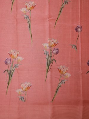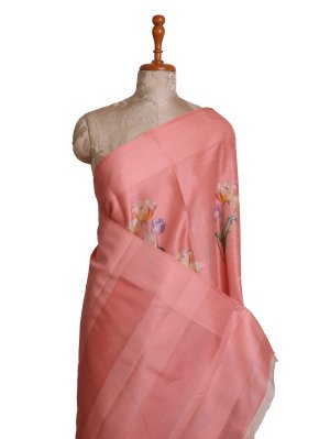 This Coral Pink Printed Tussar Silk saree radiates a warm and vibrant glow, beautifully adorned with orange and purple tulip floral motifs. The body is elegantly bordered by a self-colored jute finish trim, adding a touch of rustic craftsmanship to the soft silk texture. With its matching pink pallu and striped blouse, this piece is a standout choice for high-fashion ethnic styling.