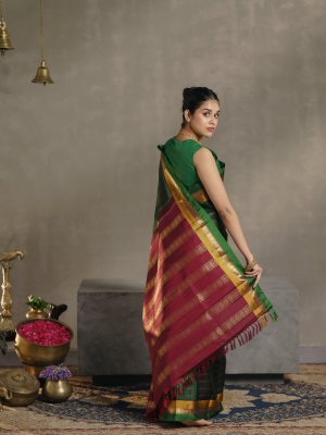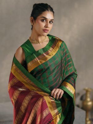 This exquisite bottle green checked Kanjeevaram silk saree features finely woven maroon muthu checks across the body, lending it a rich and traditional charm. The striking three-colour border in yellow, maroon, and green adds depth and contrast, with the maroon panel highlighted by an elegant kamalam zari pettu. Completing the look is a grand pallu, beautifully adorned with a classic 7-patta kamalam design in lustrous zari, making this saree a timeless choice for weddings and festive occasions.